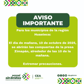 El director general, Pascual Martínez Sánchez, informó que la Comisión Nacional del Agua (Conagua) programó la apertura controlada de las compuertas de la presa Zimapán, ubicada en los límites de Hidalgo y Querétaro, cuyo cauce desemboca en el Río Moctezuma, que cruza varios municipios de San Luis Potosí. Por esta razón, se ha intensificado la alerta y el monitoreo preventivo en la zona.